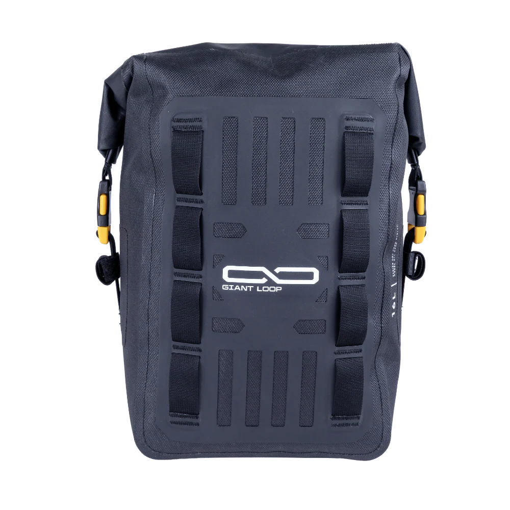 Webbing daisy chains and aluminum D-rings for secure lashing to vehicle. Mounts with or without Giant Loop Saddlebags and/or Panniers.